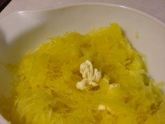 7. Grasp one half of the spaghetti squash with an oven mitt and loosen squash with a fork. Scoop squash into a large bowl; repeat with other half. Stir in 1 tbsp of soft butter until fully melted.