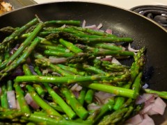 6. Heat olive oil in a non-stick skillet or frying pan over medium-high heat. Add red onions and cook, stirring occassionally, until slightly transluscent, approximately 2 minutes. Stir in asparagus, cooking until tender – a little char is preferred, as it adds a modest smokey flavor and extra crunch. Top with crumbled feta, a dash of garlic powder, and black pepper to taste. Turn the heat to low.