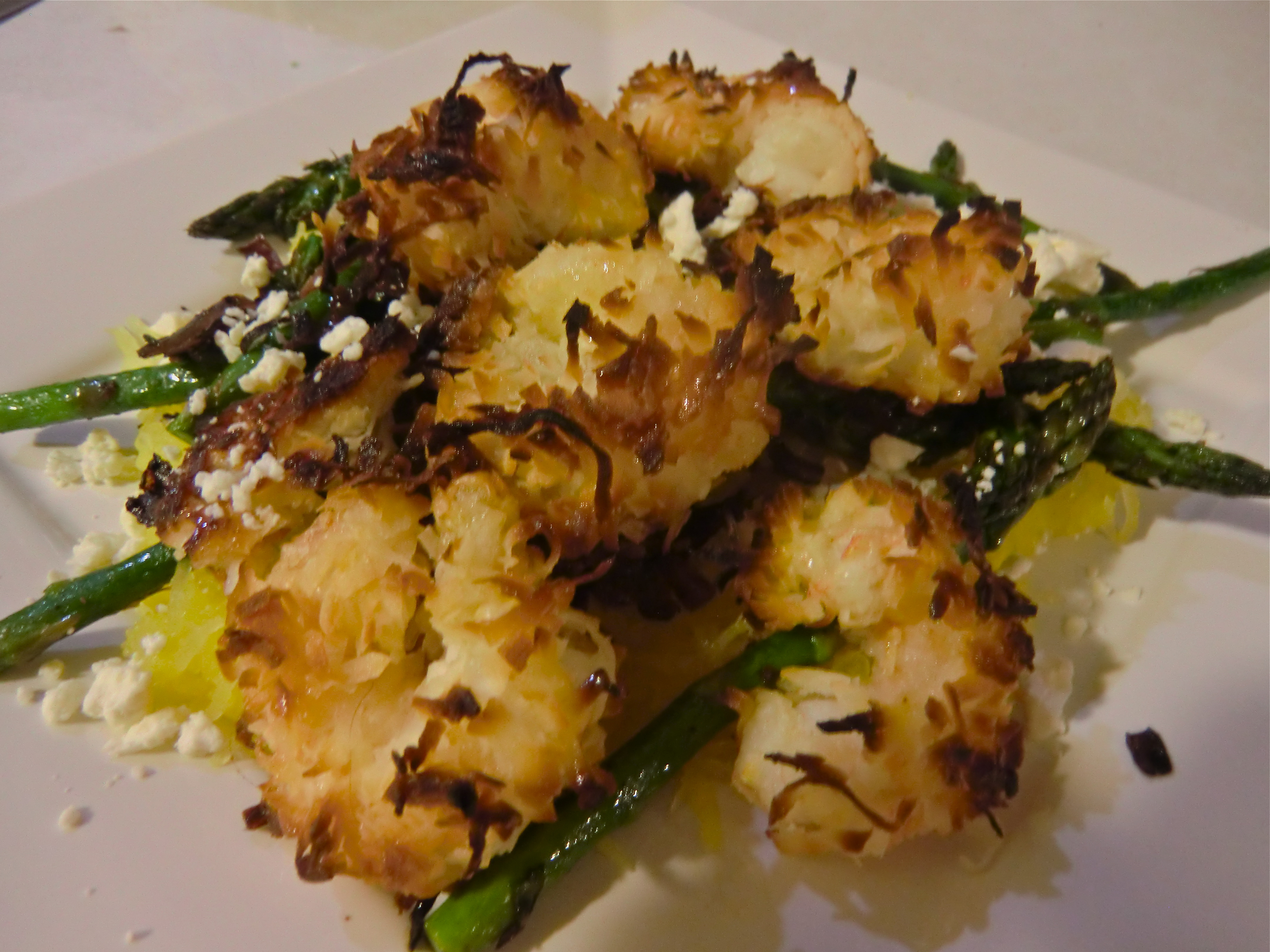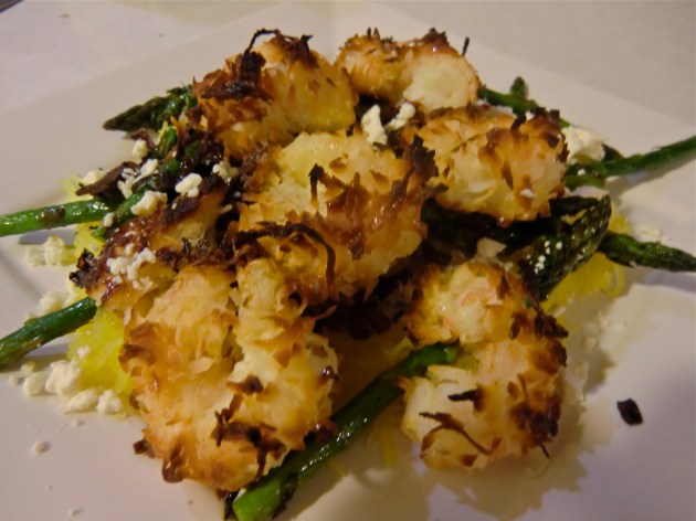 Roasting spaghetti squash is probably the simplest method of preparation but also enhances the sweetness of the squash. Combined with slightly crunchy asparagus, aromatic red onion, and the tangy creaminess of feta cheese, and you have a side dish perfect for any season. Serve with your favorite grilled meat this summer or pork tenderloin in the fall. See this summer recipe for Coconut Shrimp – delicious served atop the recipe below.
