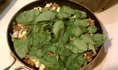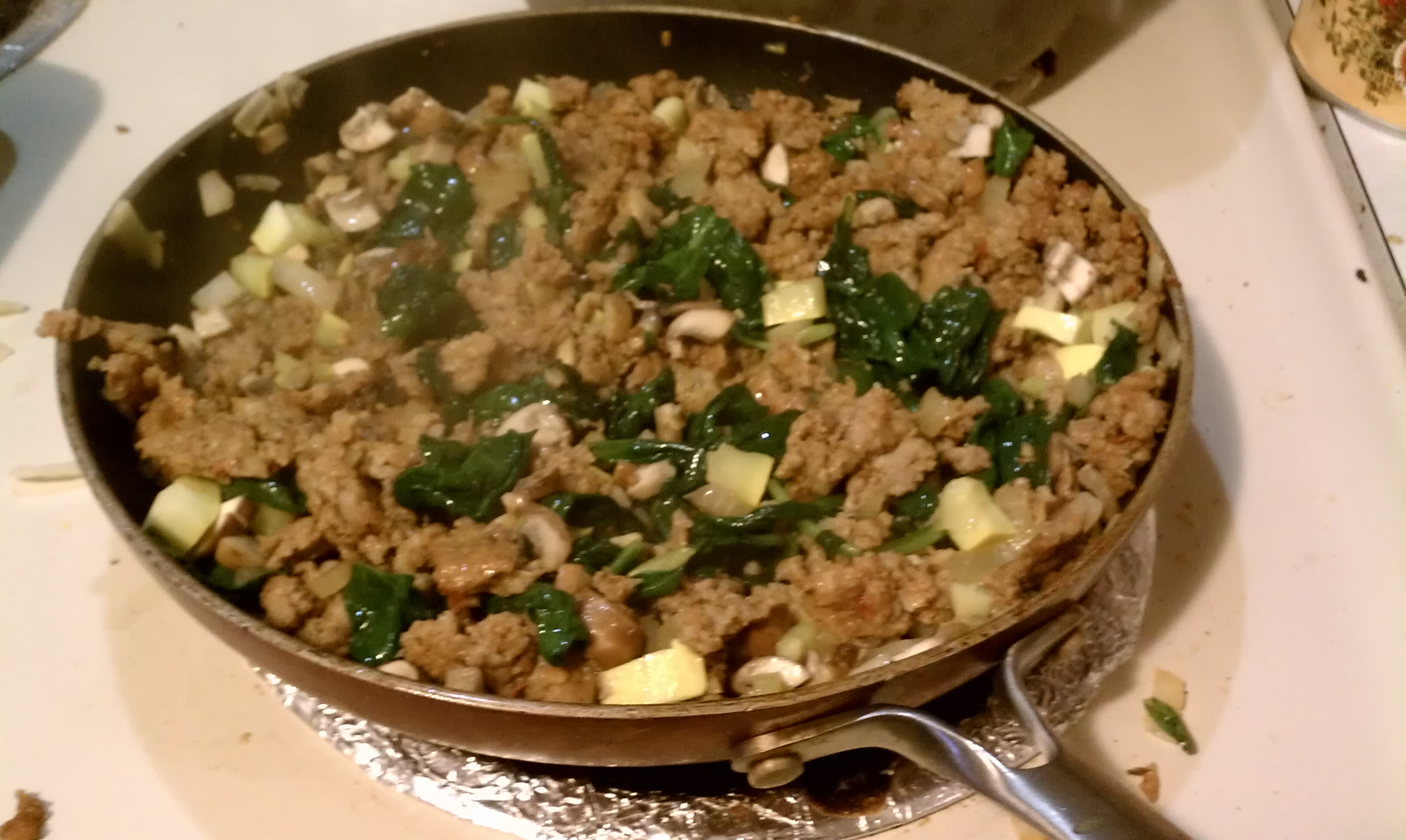 3. Coat a large nonstick frying pan or skillet with cooking spray and heat over medium-high heat. Add sausage, cook, crumbling with a wooden spoon, until browned. Add onion and cook until slightly tender and fragrant, about 2 minutes. Add mushrooms and water, cook for another 2 minutes, stirring and crumbling the sausage more, then add zucchini and squash, stirring occasionally until the sausage is cooked through, the water has evaporated, and the vegetables are tender. Turn heat down to medium and add spinach stirring until it turns a dark green color and is mostly wilted, remove from heat.