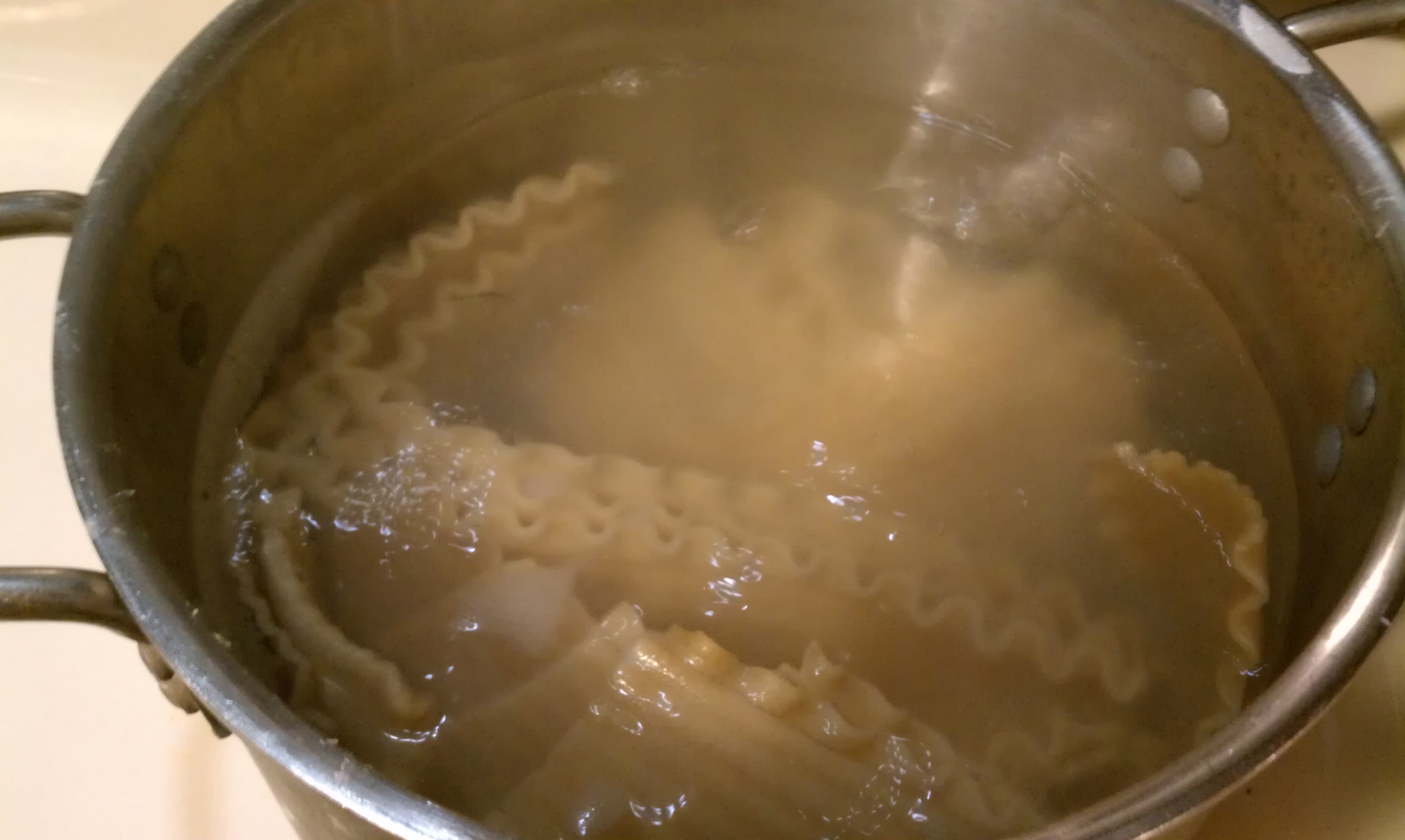 2. Bring a large pot of water to a boil. Add noodles and cook until not quite tender. If your pot is too small and the noodles stick out a bit, flip them over using a fork and oven mitt once the submerged end is slightly tender and more flexible. Once the noodles are cooked, drain, return the noodles to the pot and cover with cool water.