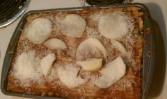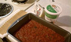 5. To assemble lasagna: Spread 1/2 cup of the tomato mixture in the prepared backing dish. Arrange a layer of noodles on top (approximately 5 noodles). Dollop half the ricotta over noodles, spreading until even.