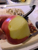 9. Using a sharp paring knife or peeler, remove outer skin of apple. Place in a uprght position with stem (if still intact) on top and slice in half. Slice each remaining half in half (cutting the apple into four pieces) and remove seeds. Once peeled and the seeds have been removed, dice or thinly slice the skinless apple.