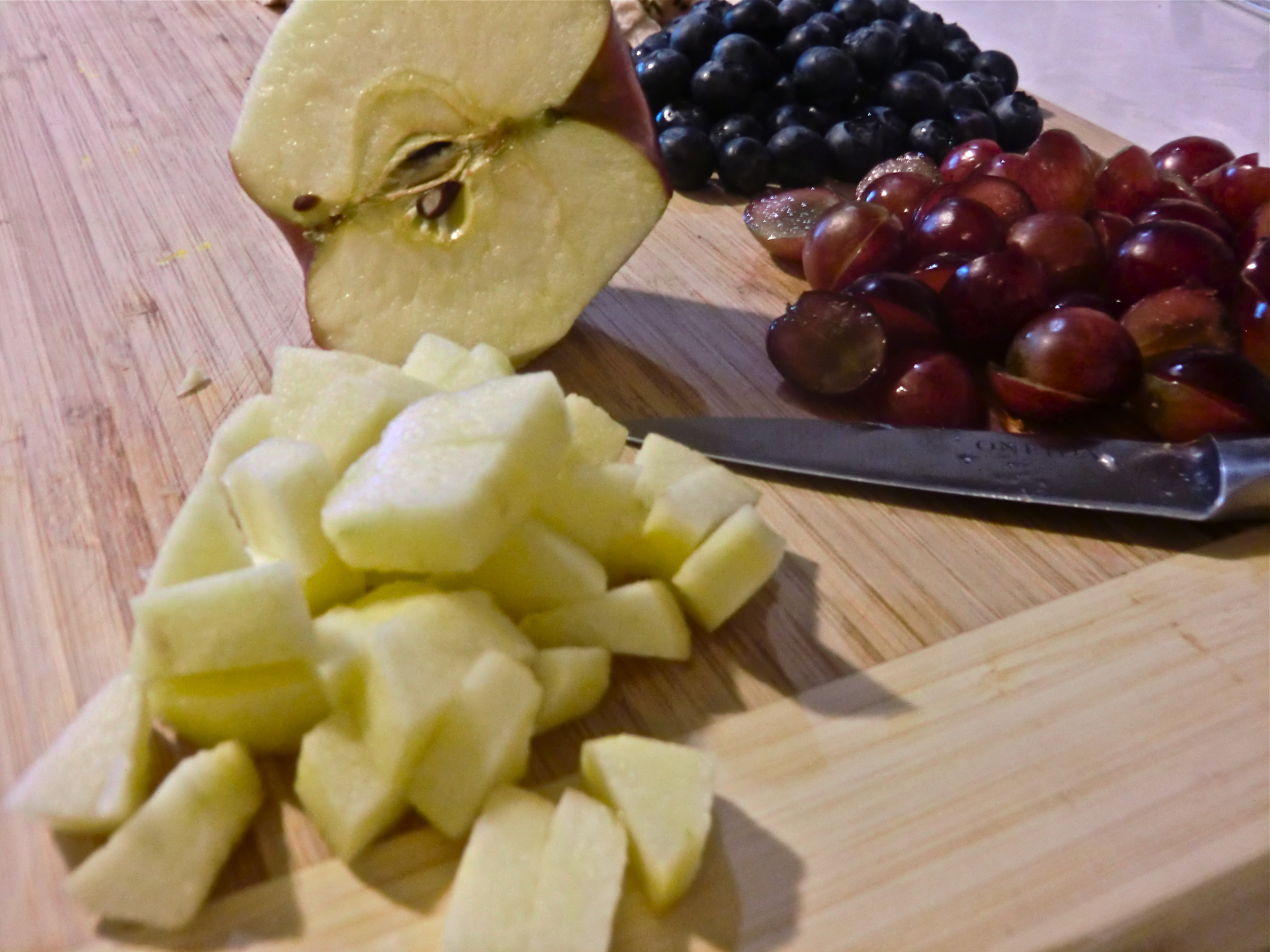 7. Slice grapes in half and add to bowl.