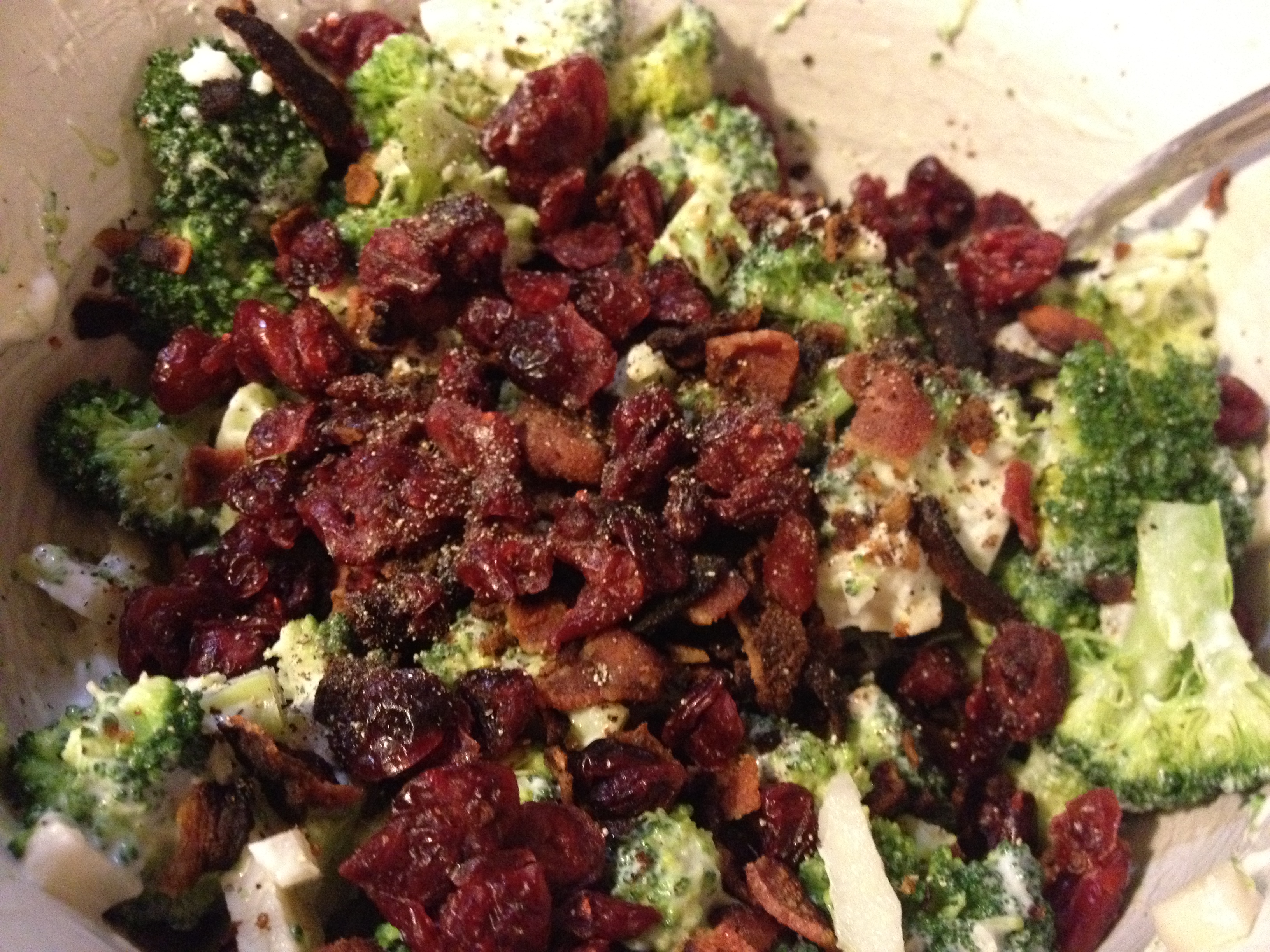 6. Add broccoli, water chestnuts, crumbled bacon, cranberries, walnuts (optional), and pepper. Stir to coat with dressing.