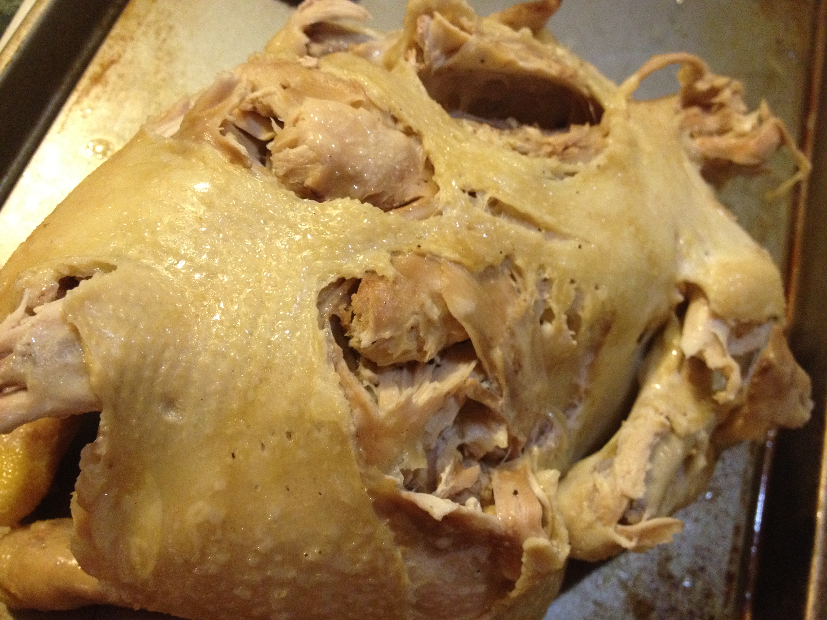 5. Remove all skin from the outside of the chicken. Using a fork and your fingers, scrape the chicken away from the bones, shredding it into small pieces. Discard carcass when finished.