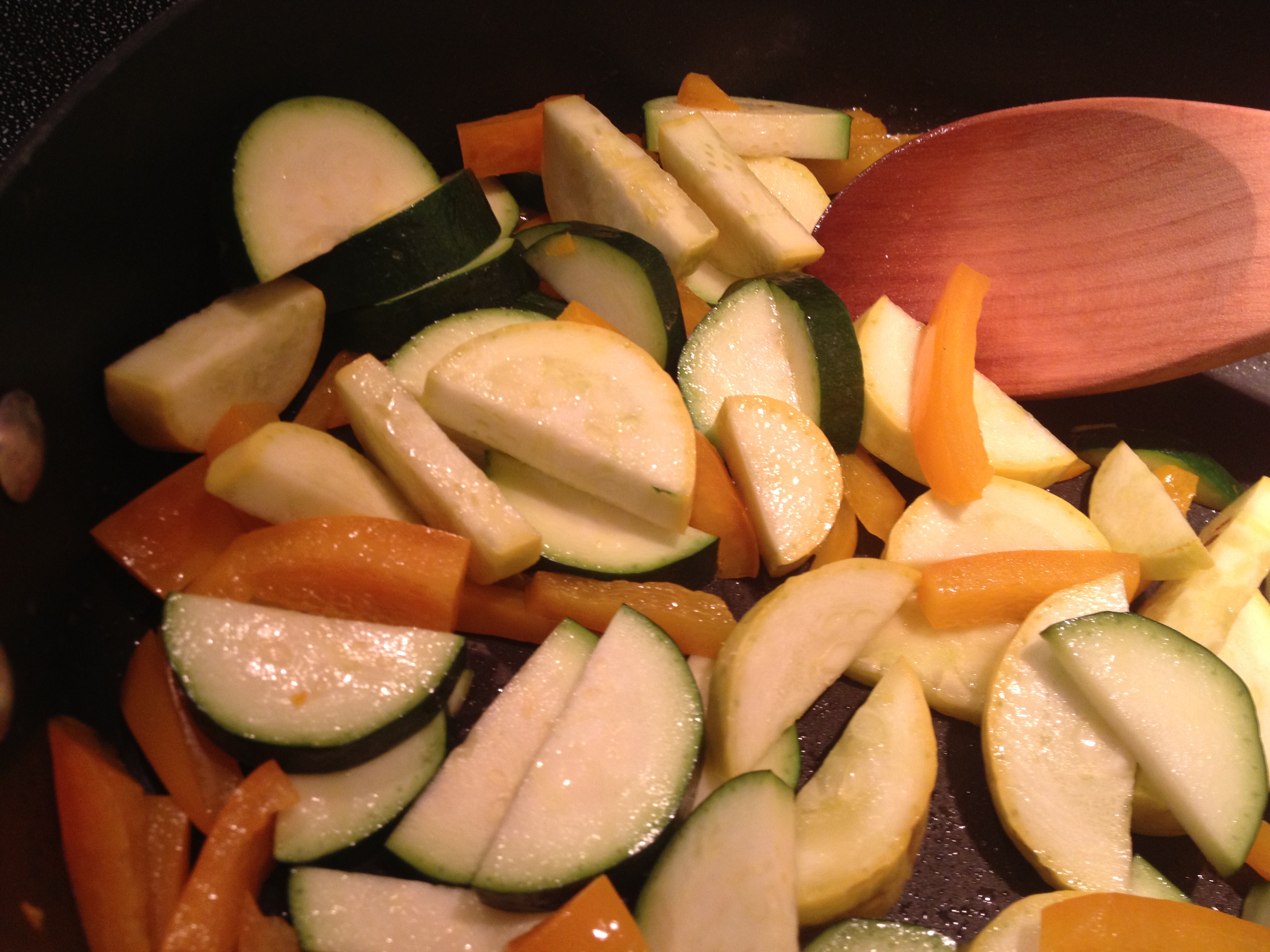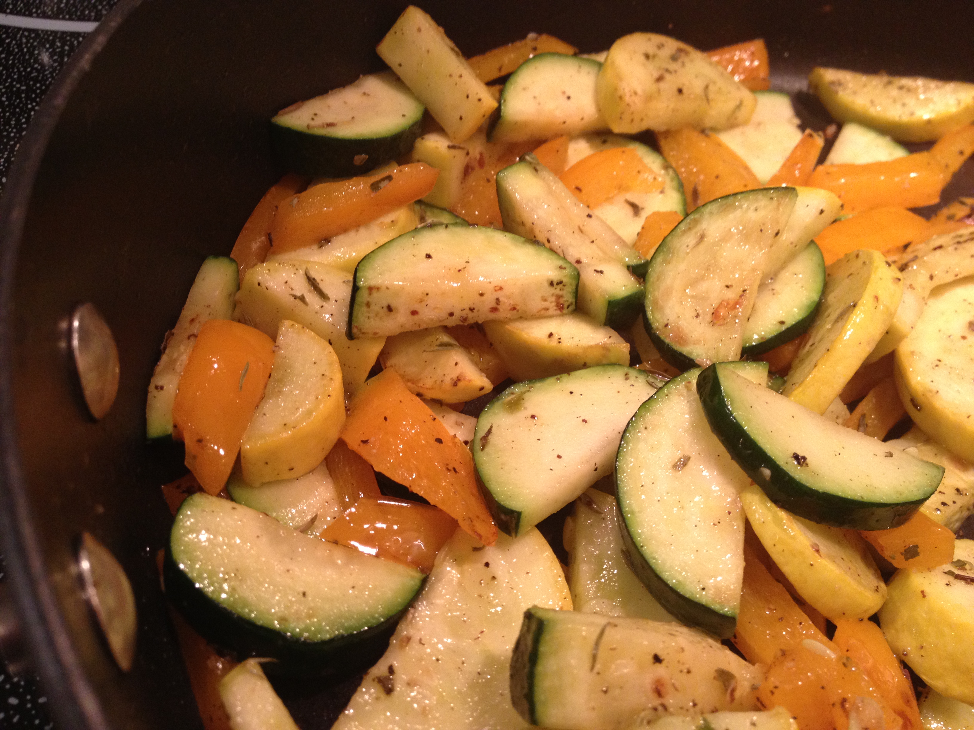 4. Heat oil in a medium non-stick skillet over medium-high heat. Add zucchini, yellow squash, and bell pepper, stirring to coat all sides with oil. Add savory, salt, and pepper, stirring until melded to vegetables. Cook until vegetables are just tender, about 5 minutes – make sure not to overcook, otherwise the vegetables will become mushy.