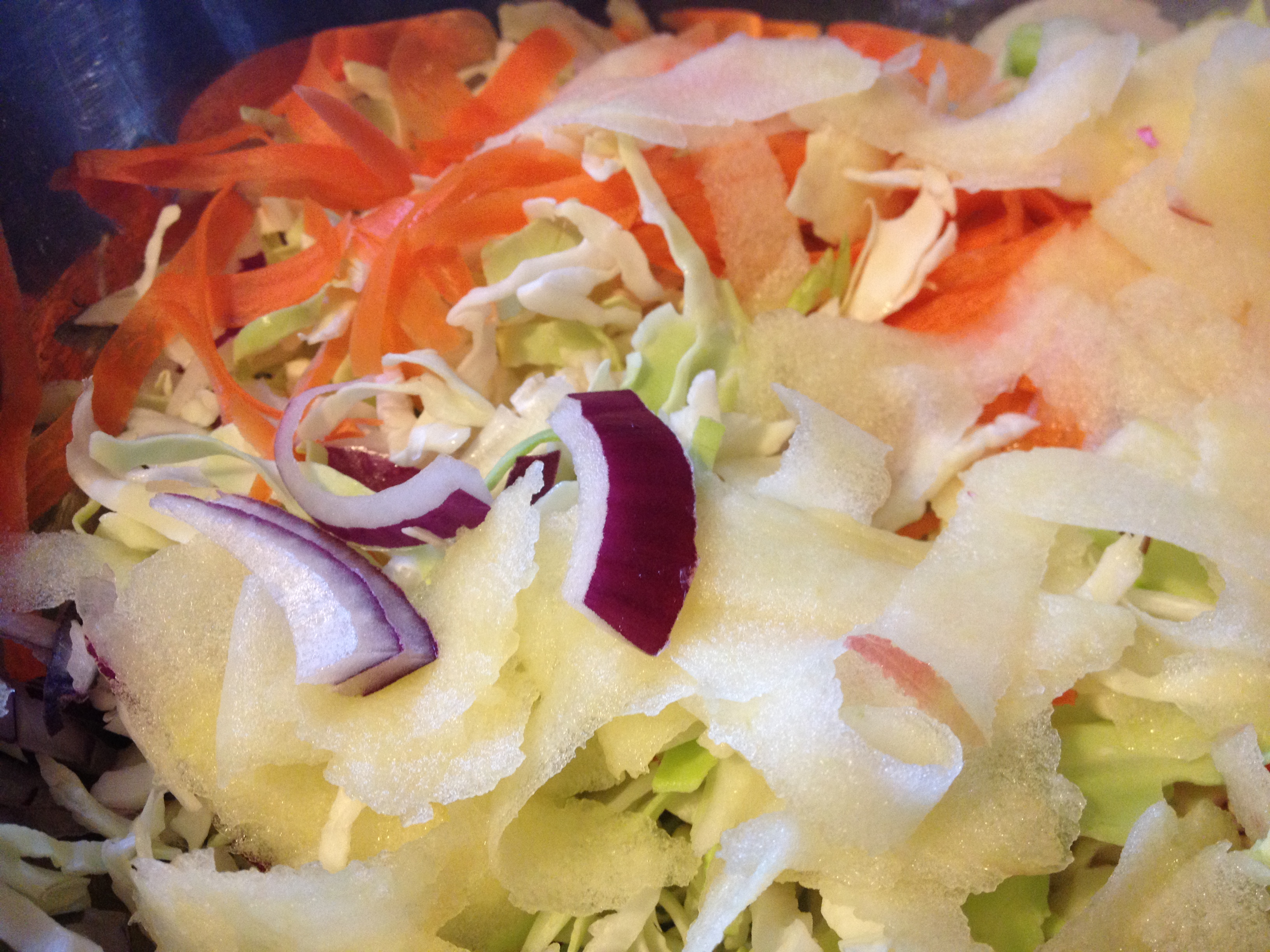 1. In a large bowl, combine cabbage and onion. Using a peeler, thinly shred carrot and apple into bowl.