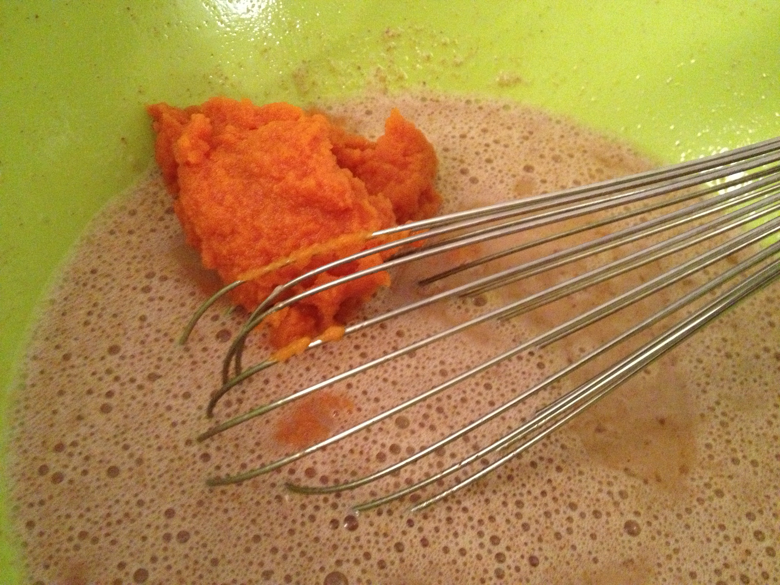 2. In a large bowl, combine brown sugar, pumpkin pie spice, salt, cinnamon, evaporated milk, egg, and egg whites, stirring with a whisk. Slowly stir in pumpkin, and whisk until smooth.