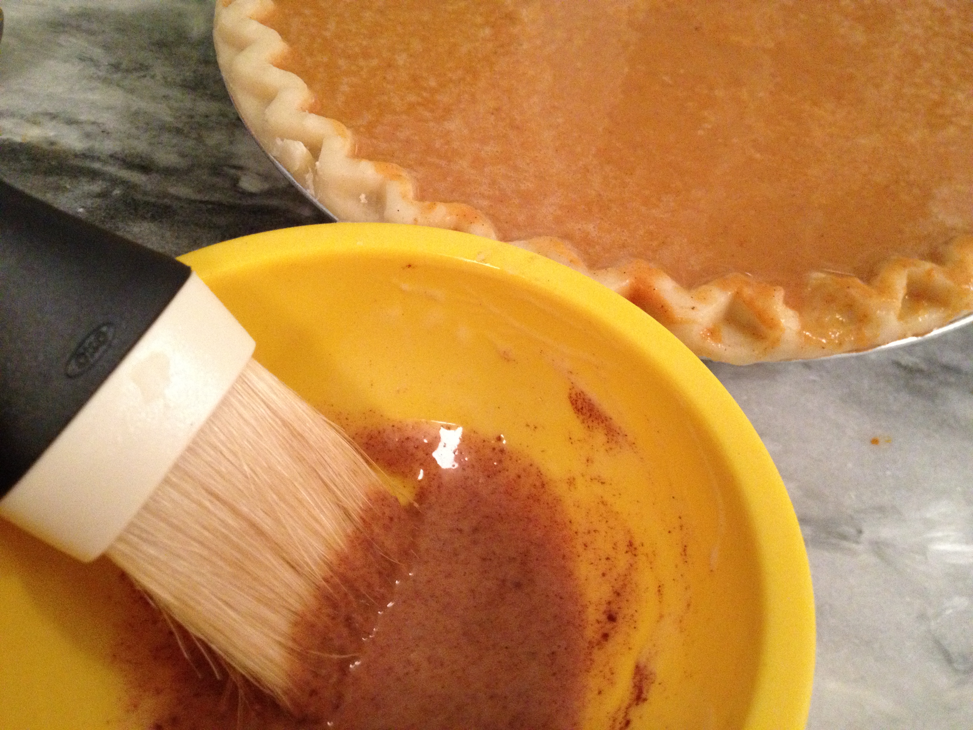 4. In a small bowl, whisk butter, cinnamon, and sugar, until well-combined. Evenly brush mixture on edge of crust.