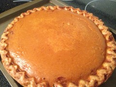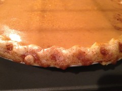 3. Keep pie crust in the tin dish, and pour pumpkin mixture into the crust.